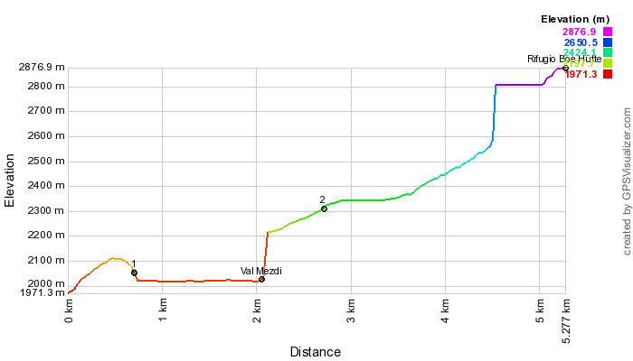 Questa escursione nella Val Mezdì parte dal parcheggio che si trova otto tornanti al di sotto del Passo Gardena, a quota (1956 m), nel versante della Val Badia. Si puo anche partire dal paese di Colfosco ma in quel caso il dislivello della salita è più grande e per questo consigliamo questa posto per la partenza. Si prende il sentiero nr. 651 porta anche all'attacco della famosa via ferrata Brigata Tridentina. Si passa oltre sempre lungo un sentiero quasi in piano fino ad arrivare nella Val Mezdì. All’altezza del Dënt de Mezdì (2881 m) il sentiero incrocia il sentiero nr. 676, che arriva Rifugio F. Cavazza al Pisciadù (2585 m). Ci si tiene sempre sul sentiero nr. 651 che percorre tutta la Val Mezdì. L'ultimo tratto della valle la salita si fa un po più impegnativa (sentiero attrezzato) ma se non ci sono state recenti nevicate o ghiacciate la salita si affronta senza problemi particolari. Subito dopo l'ultima salita e in pratica alla fine della Val Mezdì si trova il Rifugio Boè, a quota 2871 metri.
