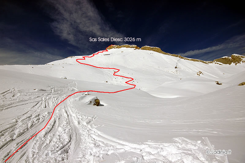 Dalla Munt de Pice Fanes si sale verso il Sas dales Diesc. La salita é abbastanza impegnativa e non segue un sentiero segnato perchè coperto dalla neve. Si passa vicino a Col Toronn e al Ciastel de Fanes, la leggenda vuole che quest'ultimo fosse il luogo dove un tempo si ergeva il castello dei Fanes. Dopodiche in breve tempo si raggiunge un punto panoramico (3000 m) poco più in basso del Sas dales Diesc, qui è possibile scorgere vette come il Putia, le Odles e il gruppo del Puez, la Marmolada, il Sassonger; mentre più in basso si possono ammirare i prati di Armentara, Badia e gran parte della Val Badia. L'ultimo tratto di via ferrata che ci separa dalla cima del Sasso delle Dieci é sconsigliabile sopratutto se affrontato con gli scarponi da sci.