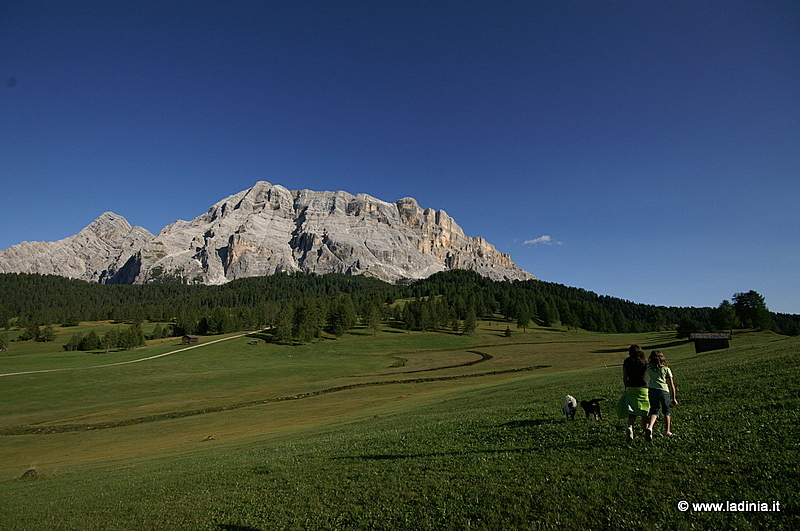 Da qui proseguite sulla sinistra e arriverete ai masi Ciablun (1572 m), Runch (1600 m) e Biei (1613 m). Dunque dirigetevi verso il bosco e proseguite sempre seguendo l'indicazione 6 che conduce al Lé de Rit (1865) e alla Crusc da Rit (2027 m). Tornate al crocevia e proseguite lungo il nr. 13 attraverso prati e mugheti. Iniziate la discesa lungo il sentiero 13A fin dopo Ciamplorët. Da qui seguite il sentiero 15B che corre lungo la parete del Sasso Croce fino a Santa Croce (2043 m). Seguite il sentiero nr. 15 per un breve tratto, proseguite a sinistra sul 15A. Al prossimo crocevia svoltate a destra sul sentiero nr. 18 che attraversa i magnifici prati di Armentara. Proseguite in discesa sul 18A attraverso i boschi fino alla località Al Bagn (1420 m). Da qui seguite il sentiero nr. 2 che attraversa un boschetto e continua poi su strada asfaltata fino in centro paese.