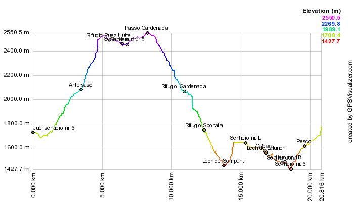 Percorso ad anello di 24 chilometri che passa per la Valle di Antersasc per salire fino all’altipiano del Puez (Rifugio Puez) e ridiscendere verso La Villa passando per il Rifugio Gardenacia. Il tracciato è stato registrato con partenza dal Passo Juvel (1725 m) ma si può anche partire dal Lech da Sompunt a Pedraces per passare dal Lech Lalunch, Sotgherdëna e poi salire verso Pescol e il Passo Juvel. Per fare l’intero percorso si impiega una intera giornata ma sul tracciato non mancano rifugi e punti di ristoro.